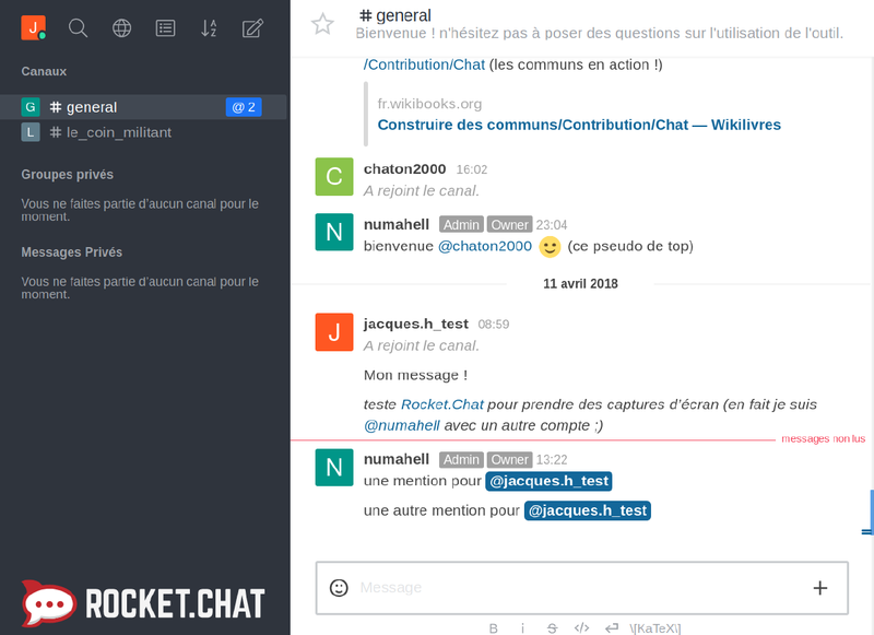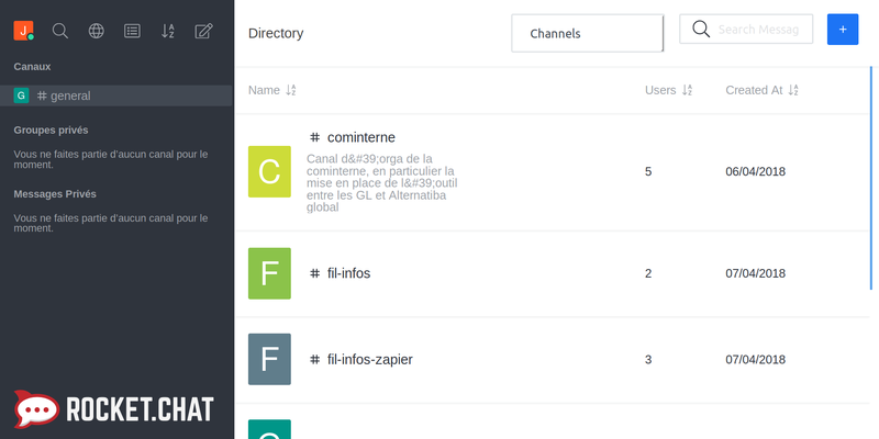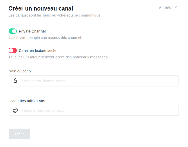 Pour créer un nouveau canal, cliquer sur le bouton d'édition dans le menu de gauche. Le créateur du canal en devient le seul propriétaire.