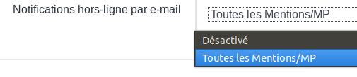 Par défaut vous recevez les notifications par mail à chaque message perso ou à chaque “mention” de votre pseudo lorsque vous êtes déconnecté.
